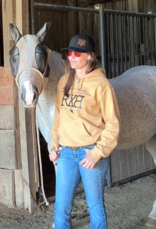 Old Gold signature RXB RanchX Branded Hoodie with a Chest Logo and pocket label, This is a top of the line Heavy Weight Hoodie with three dimensional velvety chest logo.